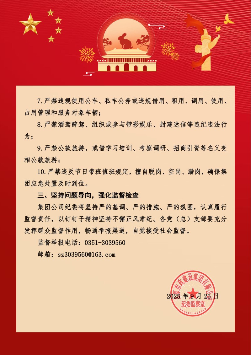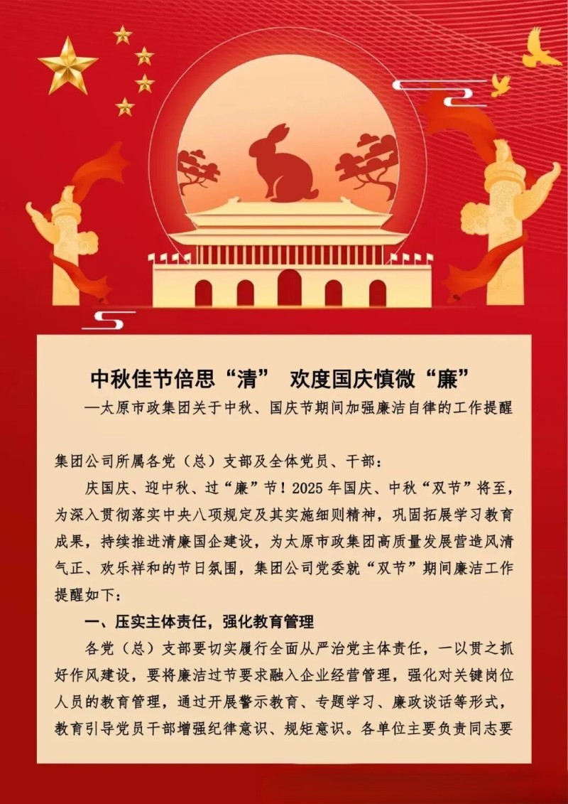 太原市政集團(tuán)關(guān)于中秋、國慶節(jié)期間加強(qiáng)廉潔自律的工作提醒